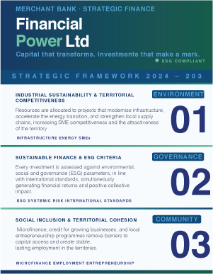 Financial Power Ltd is no ordinary financial company: it has chosen to reinvent the concept of investment so that capital becomes a lever for real development, as well as a source of return. Its vision is clear: finance must be an instrument of industrial and social progress, capable of strengthening the territories in which it operates and generating economic, human, and communal benefits. At the heart of this approach lies the idea of sustainable finance — directing investments towards activities that create economic value while simultaneously improving collective wellbeing and environmental sustainability. Financial Power Ltd finances projects of industrial impact that modernise infrastructures, help local businesses compete in new markets, and foster the adoption of more efficient and responsible production processes. The objective is not only to support large-scale initiatives but to give impetus to the entire local economic chain, creating conditions for balanced, lasting, and inclusive growth. Alongside this, the company places strong emphasis on investments with concrete social returns: support for emerging SMEs, inclusive finance instruments for local businesses and entrepreneurs, and programmes that facilitate access to credit for those normally excluded from it. This approach sets in motion a virtuous cycle in which capital contributes not only to economic profitability but also to social cohesion and community empowerment. With such a clearly defined commitment, Financial Power Ltd integrates deeply into the economic and institutional fabric of the territories in which it operates. Its role goes beyond the mere provision of financial resources: it becomes a partner to local government, participating in public initiatives, supporting development policies, and contributing to the construction of forward-looking strategies that drive the growth of the entire economy and commercial pre-eminence